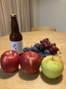 増毛の果樹園で買った、りんご(つがる)2個、品種不明(亡くなった旦那さんが植えたりんごに今年初めて実をつけたのだが品種がわからないと言われた)1個、プルーン1ケース、ぶどうはおまけ。
