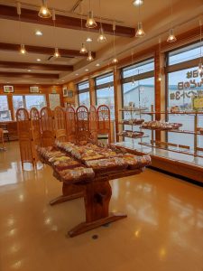 広くて明るい店内には、パンの種類は揃っています。買いたいパンをトレイに乗せ、レジで精算してもらう方式です。