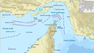 イランはホルムズ海峡の北に位置しています。海峡の南はアラビア半島の東にあるオマーンの飛び地です。なのでホルムズ海峡の真ん中に国境線があり、北半分がイラン南半分がオマーンになるはずです。